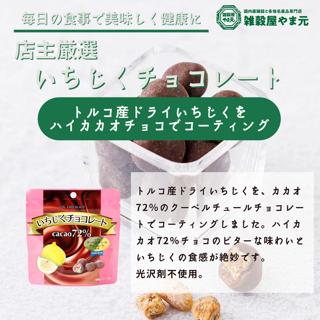 トルコ産ドライいちじくを、カカオ72%のクーベルチュールチョコレートでコーティングしました。光沢剤不使用。