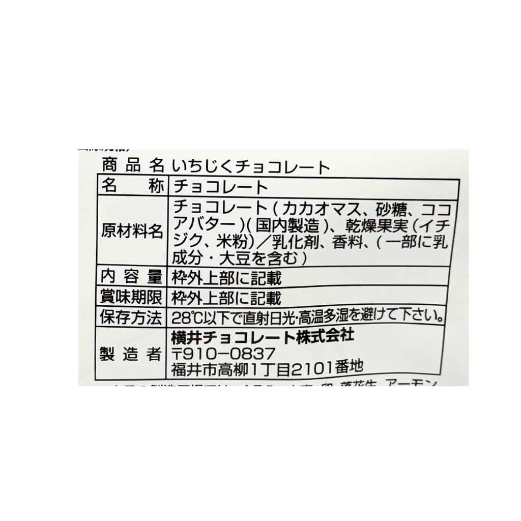 チョコレート(国内製造(カカオマス、砂糖、ココアバター))、乾燥果実(イチジク、米粉)/乳化剤、香料、(一部に乳製品・大豆を含む)
