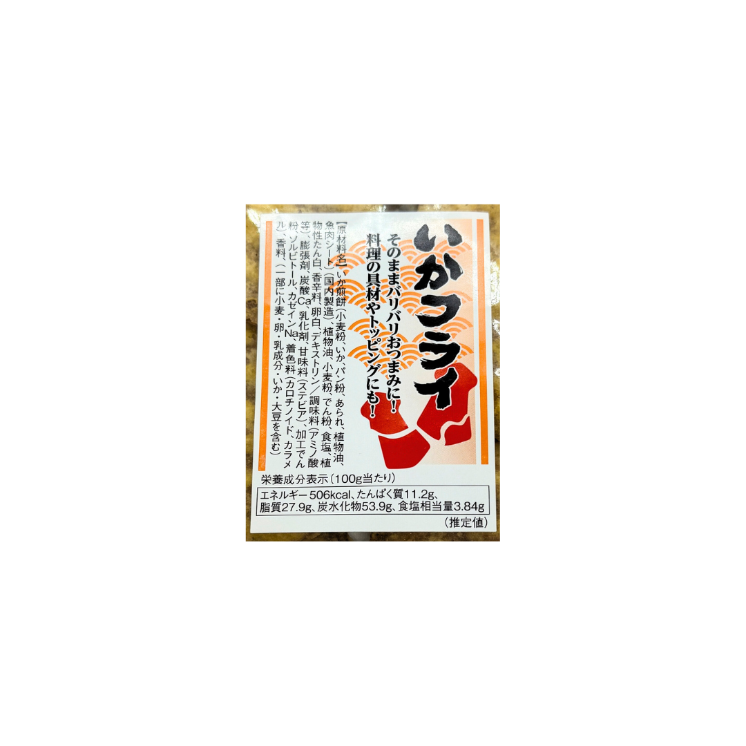 いか煎餅(小麦、いか、パン粉、あられ、植物油、魚肉シート)(国内製造)、植物油、小麦粉、でん粉、食塩、植物性たん白、香辛料、卵白、デキストリン/調味料(アミノ酸等)、膨張剤、炭酸Ca、乳化剤、甘味料(ステビア)、加工澱粉、ソルビトール、カゼインNa、着色料(カロチノイド、カラメル)、香料、(一部に小麦・卵・乳成分・いか・大豆を含む)