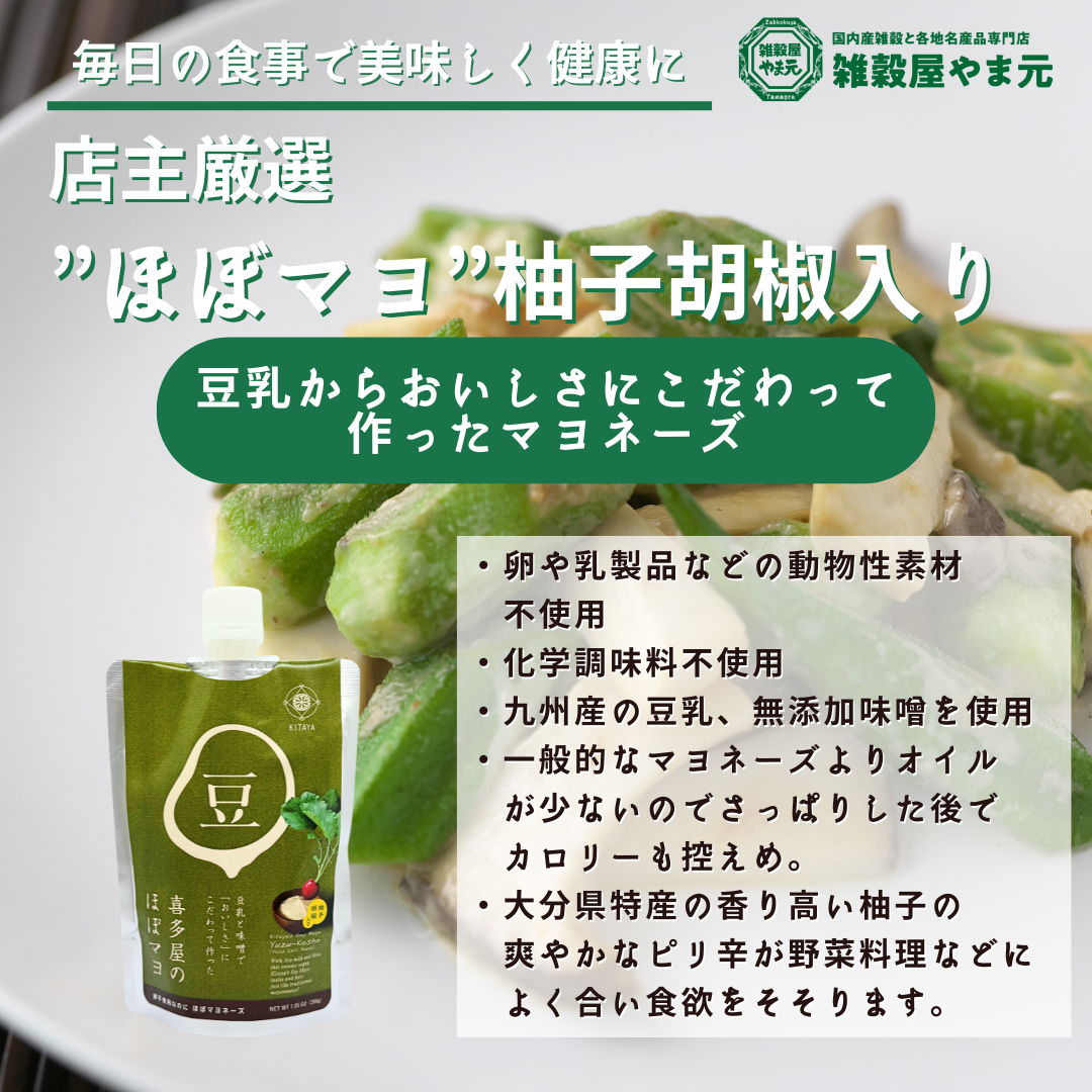 九州産の豆乳と無添加味噌で「おいしさ」にこだわってつくったオリジナル豆乳マヨ。もうこれはほぼマヨネーズ!大分県の特産柚子胡椒(九州産)入りのピリ辛。