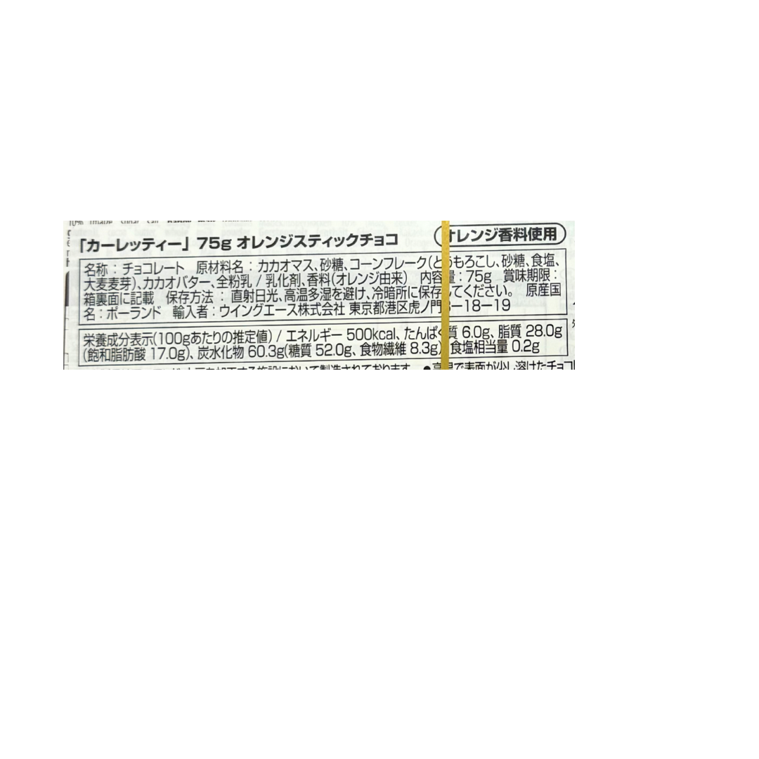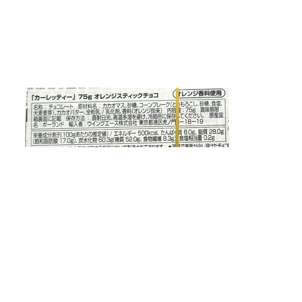 カカオマス、砂糖、コーンフレーク(とうもろこし、砂糖、食塩、大麦麦芽)、カカオバター、全乳粉/乳化剤、香料(オレンジ由来)