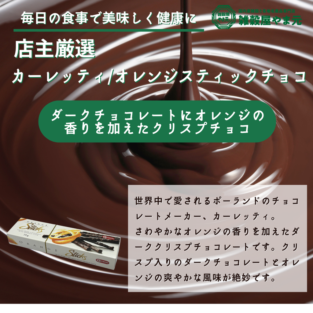 世界中で愛されるポーランドのチョコレートメーカー、カーレッティ。さわやかなオレンジの香りを加えたダーククリスプチョコレートです。クリスプ入りのダークチョコレートとオレンジの爽やかな風味が絶妙です。