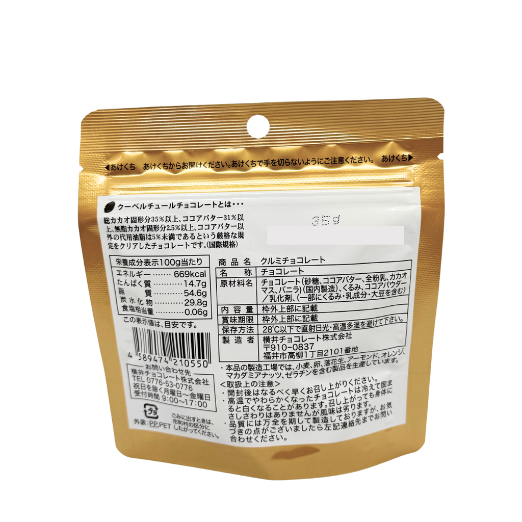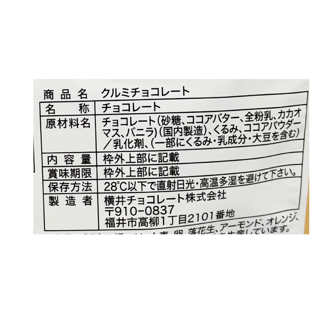 チョコレート(国内製造(砂糖、ココアバター、全粉乳、カカオマス、バニラ))、くるみ、ココアパウダー/乳化剤、(一部に乳成分・くるみ・大豆を含む)