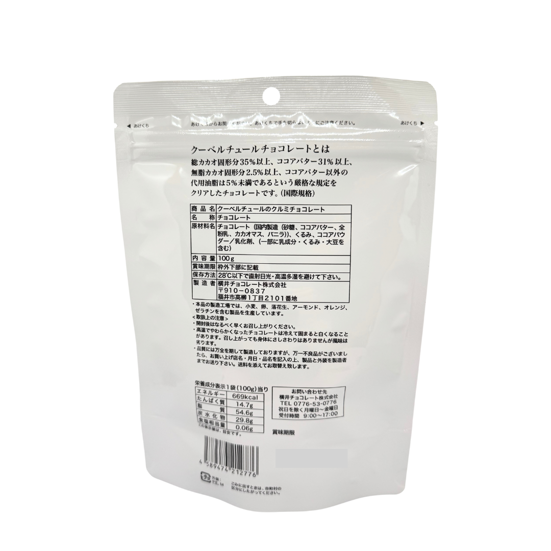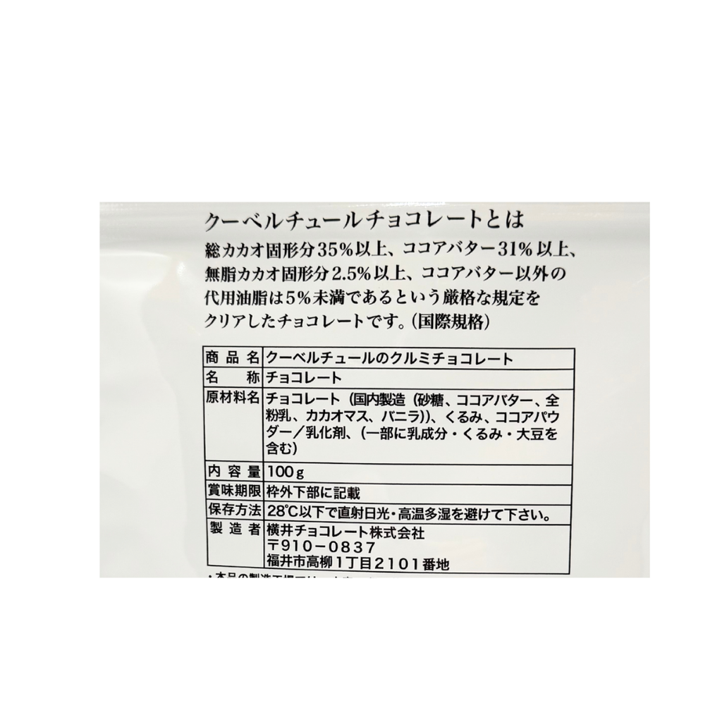 チョコレート(国内製造(砂糖、ココアバター、全粉乳、カカオマス、バニラ))、くるみ、ココアバター/乳化剤、(一部に乳製品・くるみ・大豆を含む)