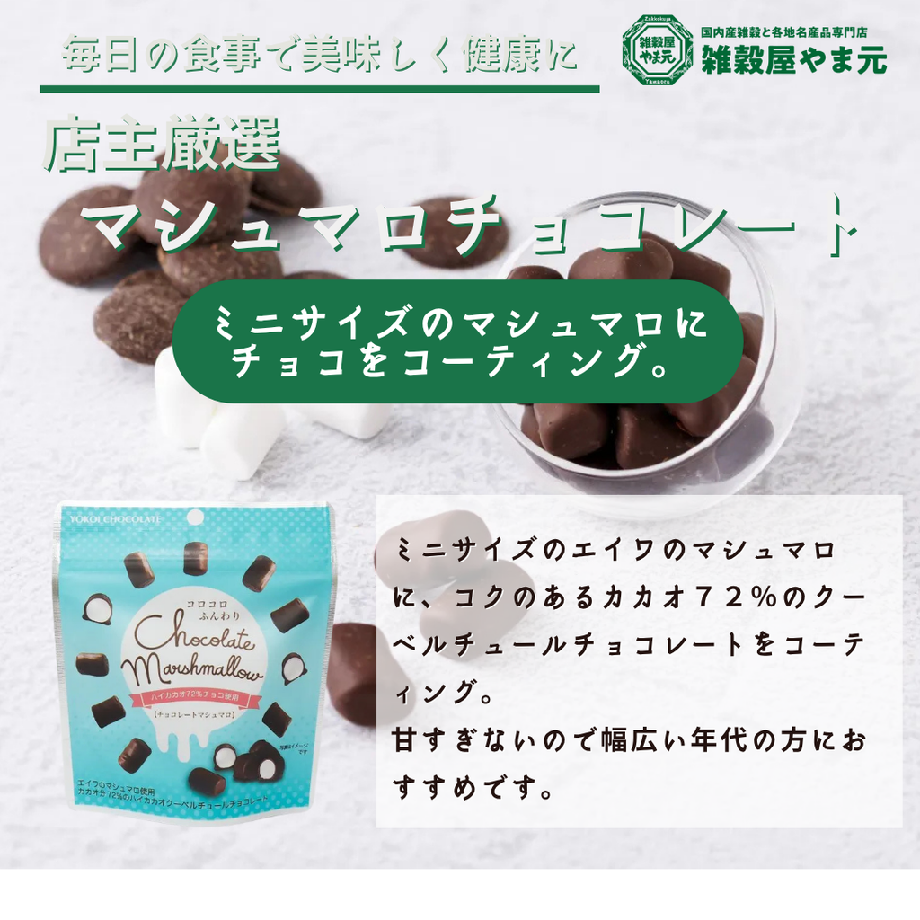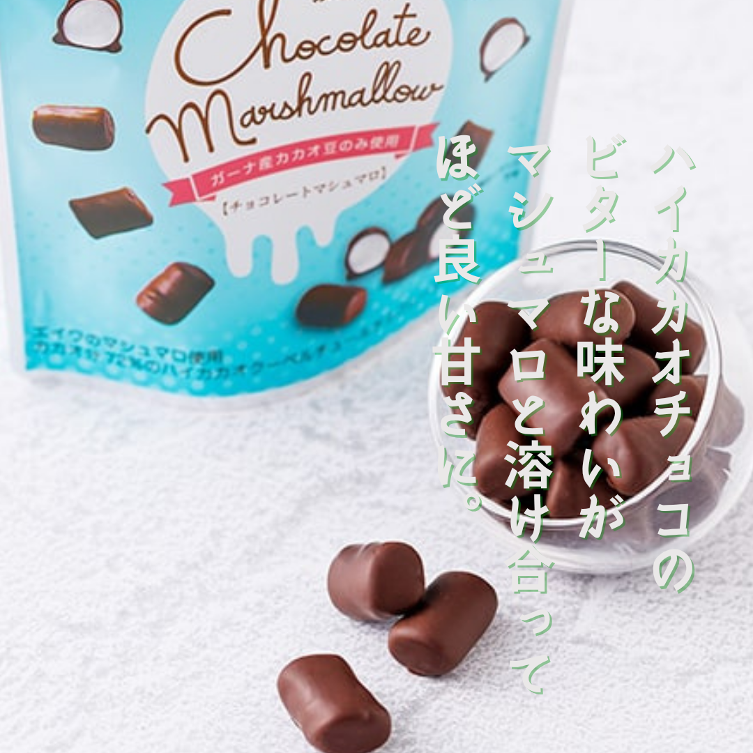ミニサイズのマシュマロに、コクのあるカカオ72%のクーベルチュールチョコレートをコーティング。ハイカカオのビターな味わいがマシュマロと溶け合ってほど良い甘さに。