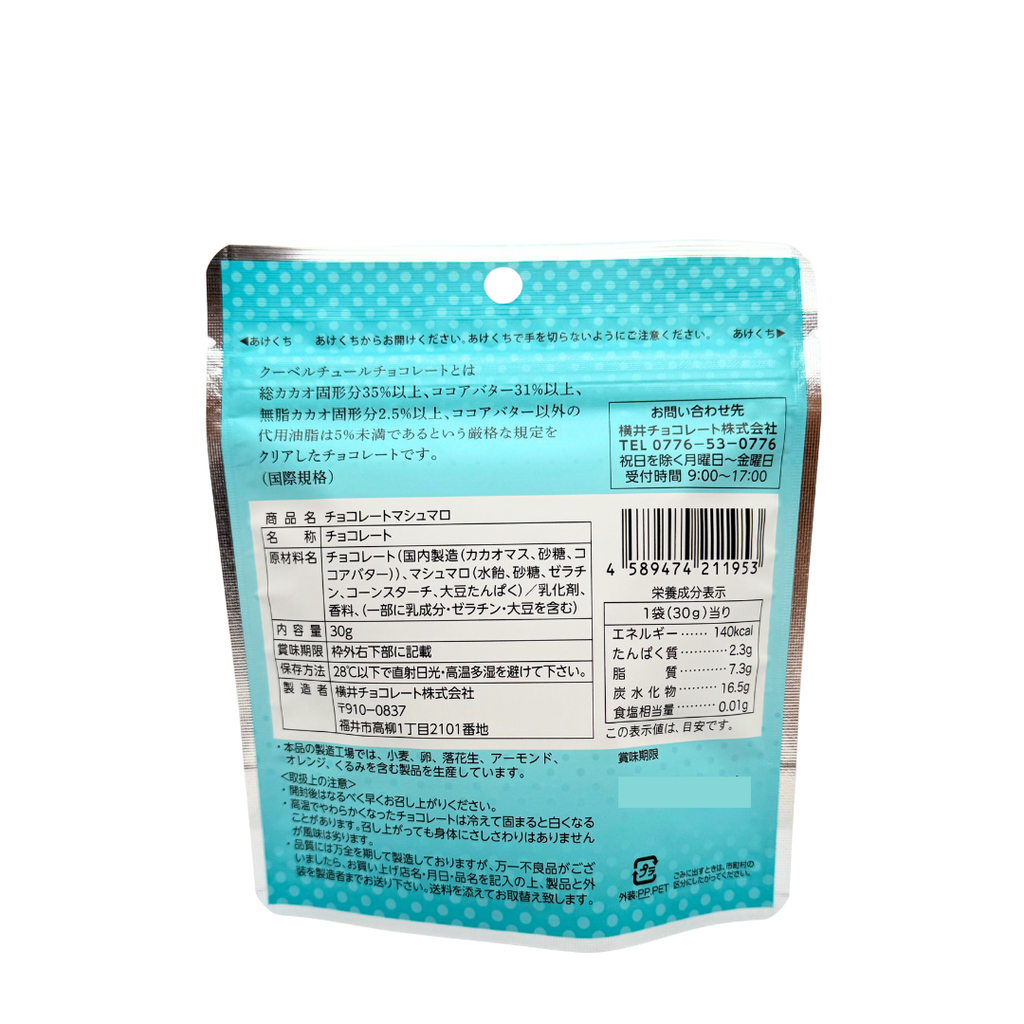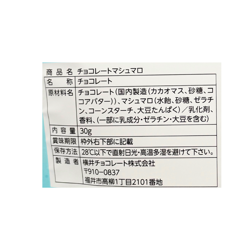 チョコレート(国内製造(カカオバター))、マシュマロ(水飴、砂糖、ゼラチン、コーンスターチ、大豆たんぱく)/乳化剤、香料、(一部に乳成分、ゼラチン、大豆を含む)