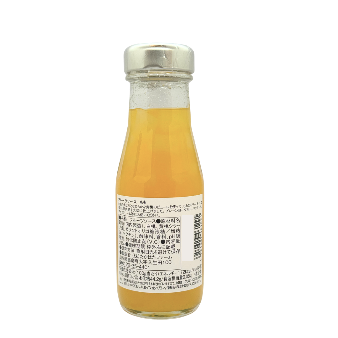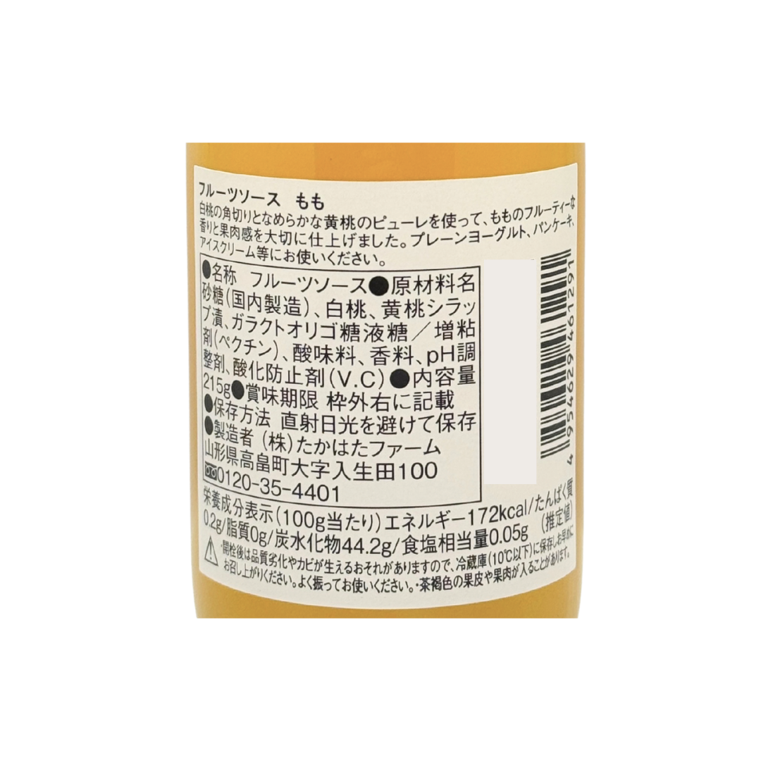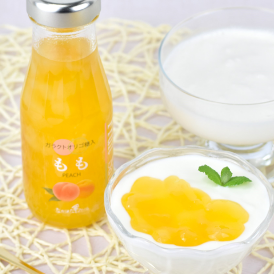 砂糖(国内製造)、白桃、黄桃シラップ漬、ガラクトオリゴ糖液糖/増粘剤(ペクチン)、酸味料、香料、pH調整剤、酸化防止剤(V.C)