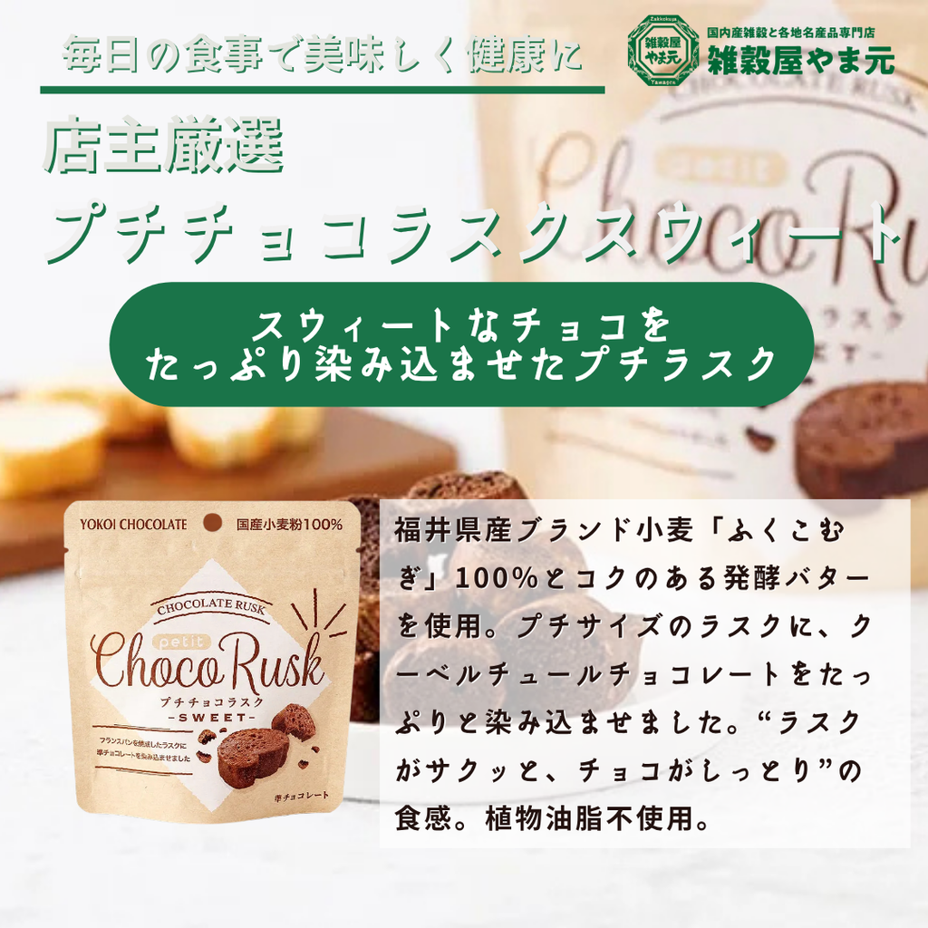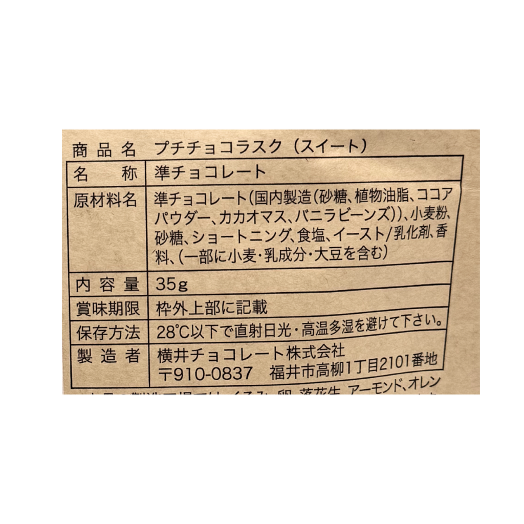 福井県産ブランド小麦「ふくこむぎ」100%とコクのある発酵バターを使用。プチサイズのラスクに、クーベルチュールチョコレートをたっぷりと染み込ませました。“ラスクがサクッと、チョコがしっとり”の食感を追求し、ラスク生地の厚さは数ミリ単位で改良。植物油脂不使用、シンプルで上質な素材にこだわりました。