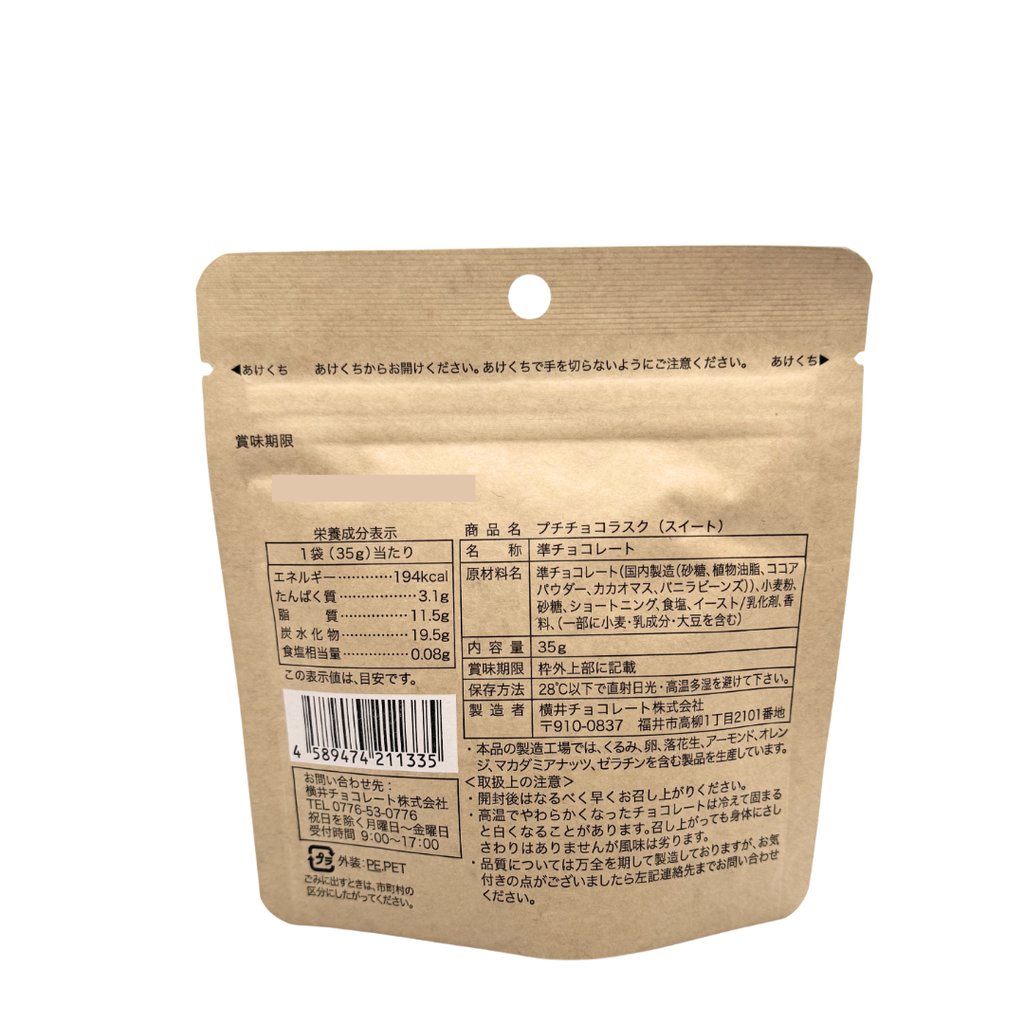 チョコレート(砂糖、ココアバター、全粉乳、カカオマス、バニラ)(国内製造)、小麦粉、カカオマス、ココアバター、砂糖、バター、イースト、食塩/乳化剤、(一部に小麦・乳成分・大豆を含む)