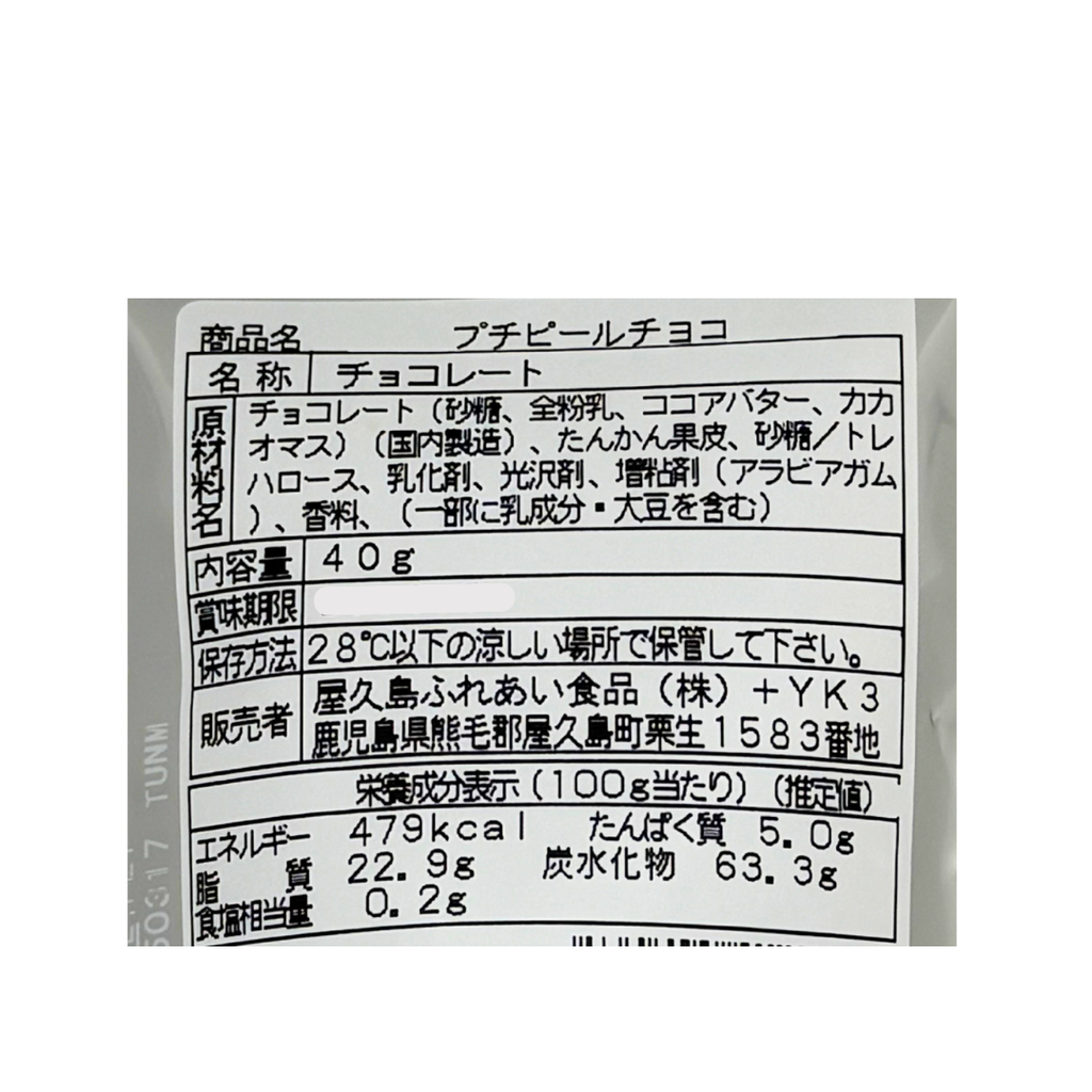 チョコレート(砂糖、全粉乳、ココアバター、カカオマス)〔国内製造〕、たんかん果皮(屋久島産)、砂糖/トレハロース、乳化剤、光沢剤、増粘剤(アラビアガム)、香料、(一部に乳化剤・大豆を含む)