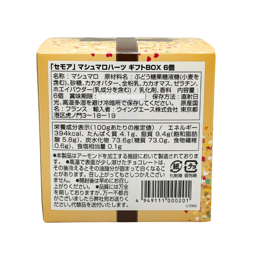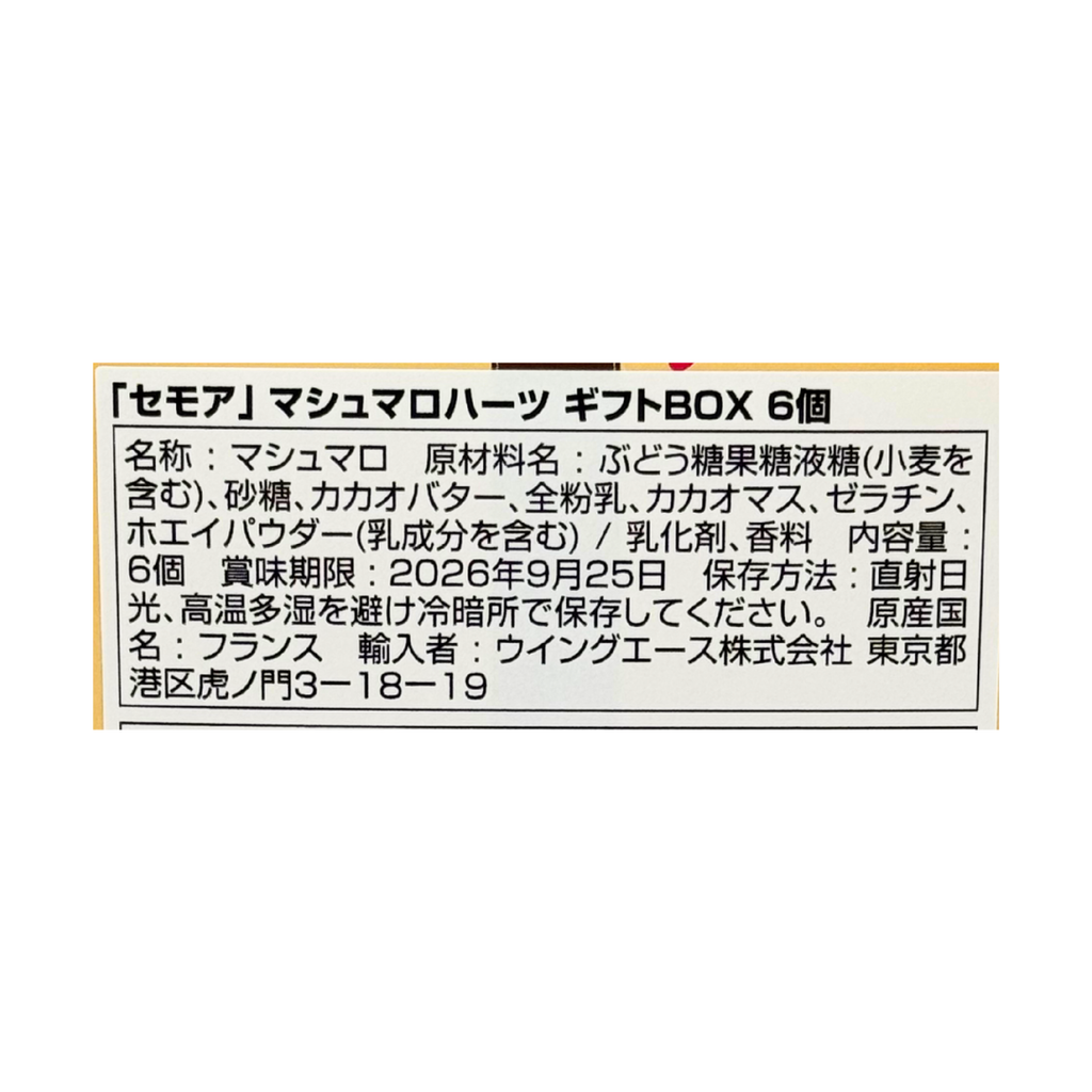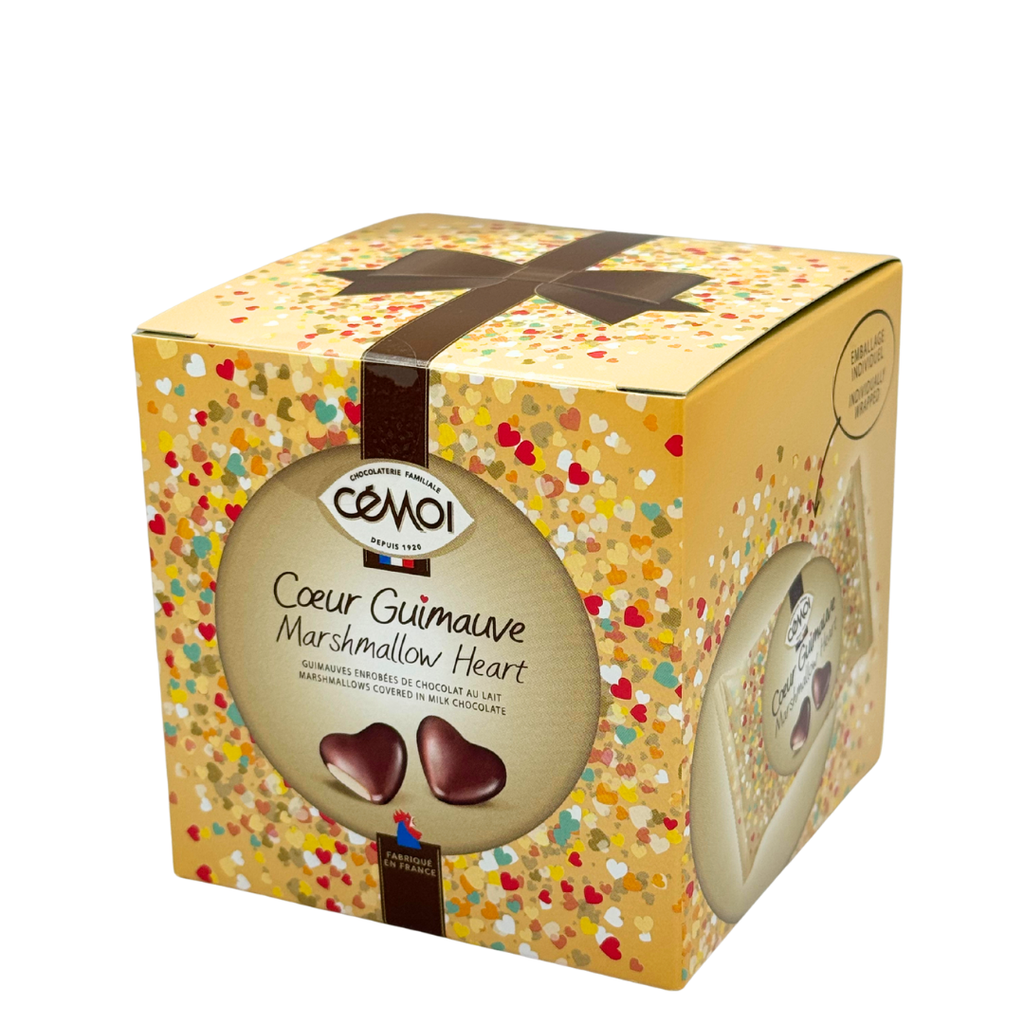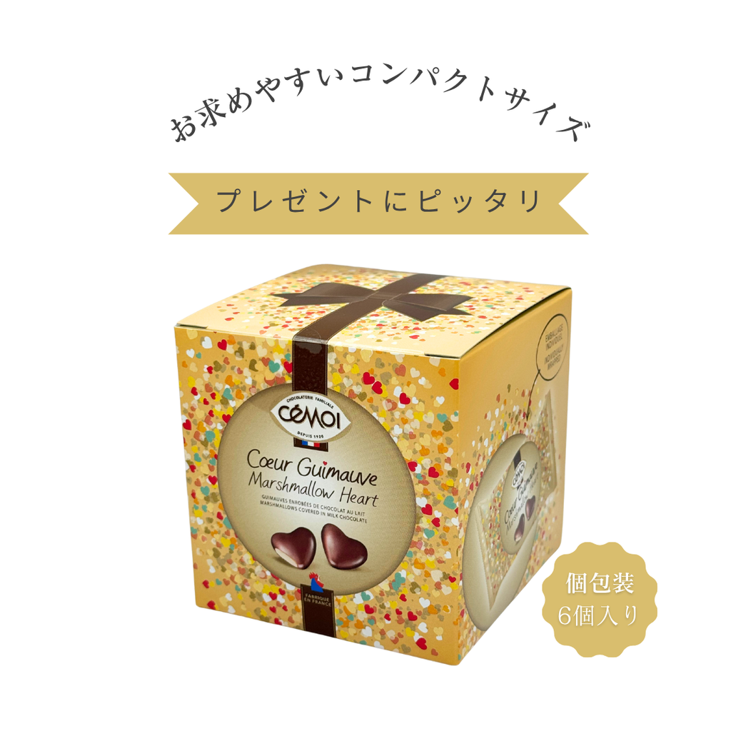 1814年の創業。世界中で認められるチョコレートのスペシャリスト、セモア。伝統のレシピをもとにチョコレートでコーティングしたハート型のギモーヴ(マシュマロ)です。食べやすい個包装。プレゼントにピッタリの可愛いケースBOX。