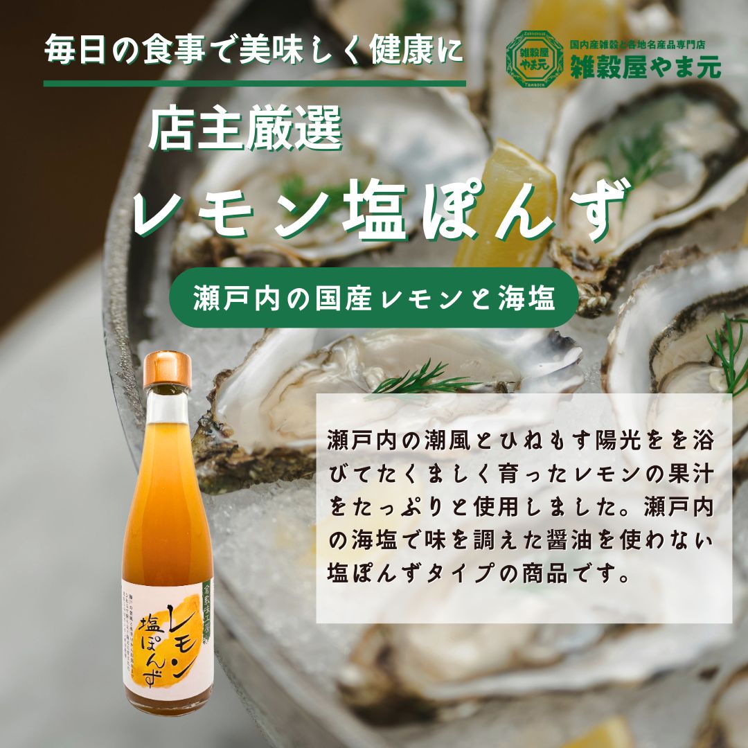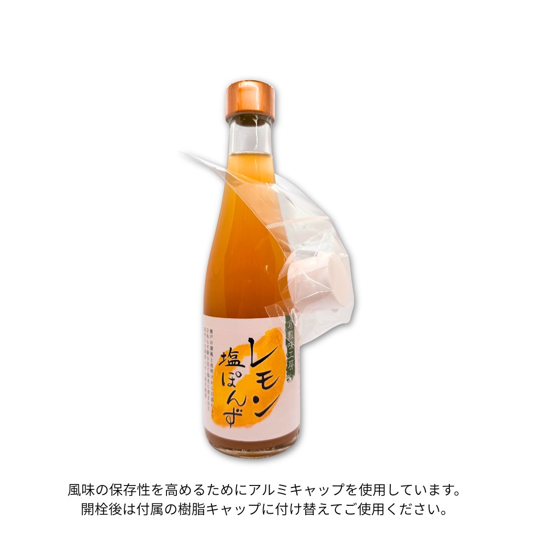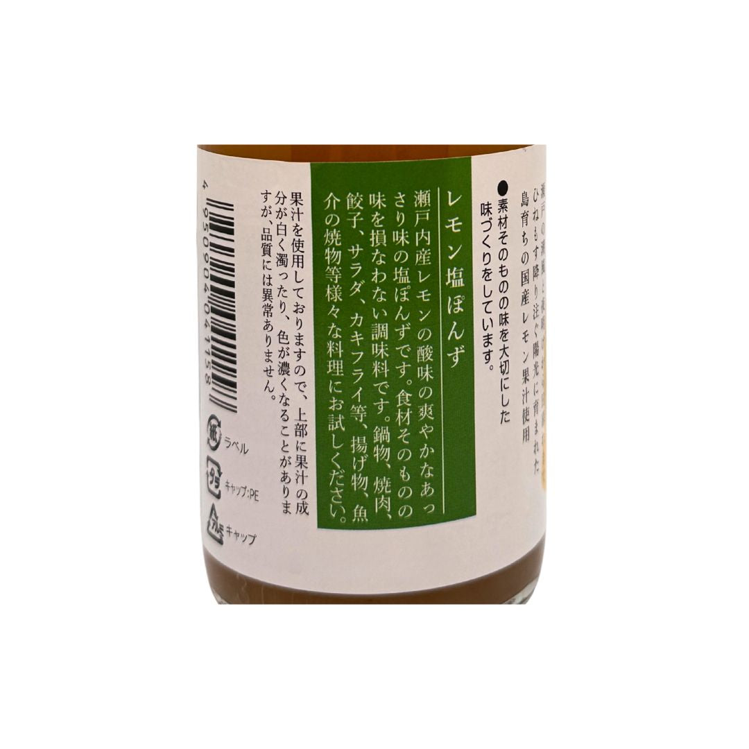 瀬戸内の潮風とひねもす陽光を浴びてたくましく育ったレモンの果汁をたっぷりと使用しました。瀬戸内の海塩で味を調えた醤油を使わない塩ぽんずタイプの商品です。 風味の保存性を高めるためにアルミキャップを使用しています。開栓後は付属の樹脂キャップに付け替えてご使用ください。
