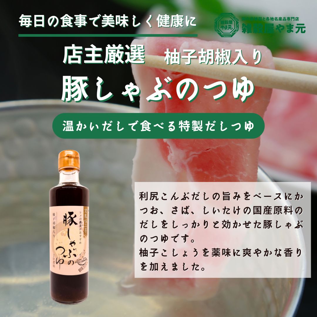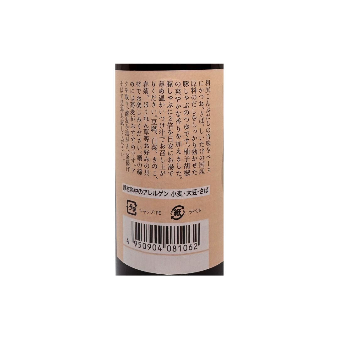 利尻こんぶだしの旨みをベースにかつお、さば、しいたけの国産原料のだしをしっかりと効かせた豚しゃぶのつゆです。柚子こしょうを薬味に爽やかな香りを加えました。