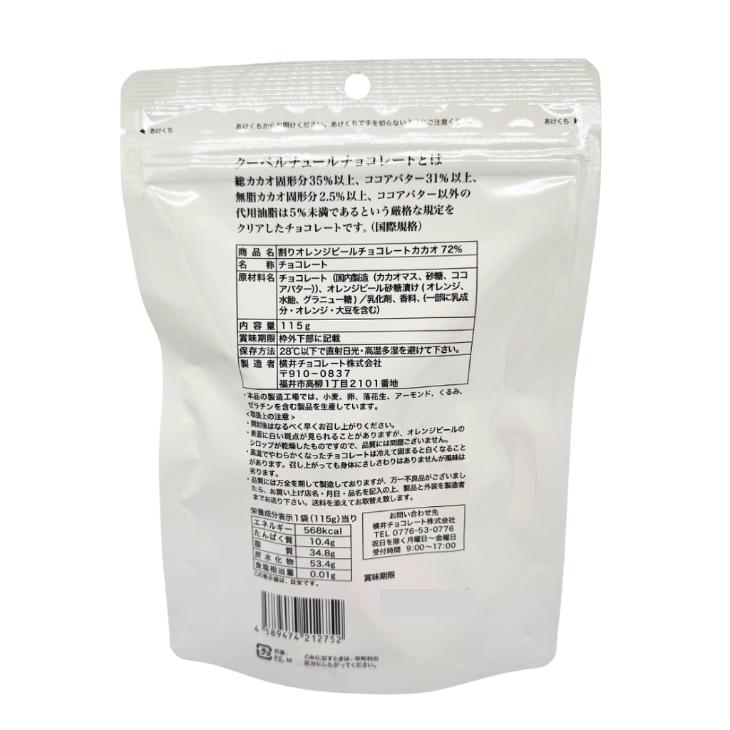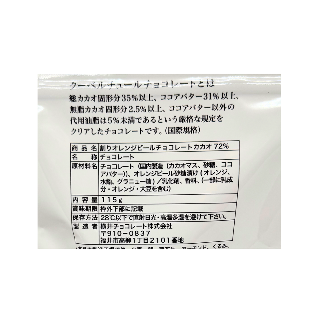 チョコレート(国内製造(カカオマス、砂糖、ココアバター))、オレンジピール砂糖漬け(オレンジ、水飴、グラニュー糖)/乳化剤、香料、(一部に乳製品・オレンジ・大豆を含む)