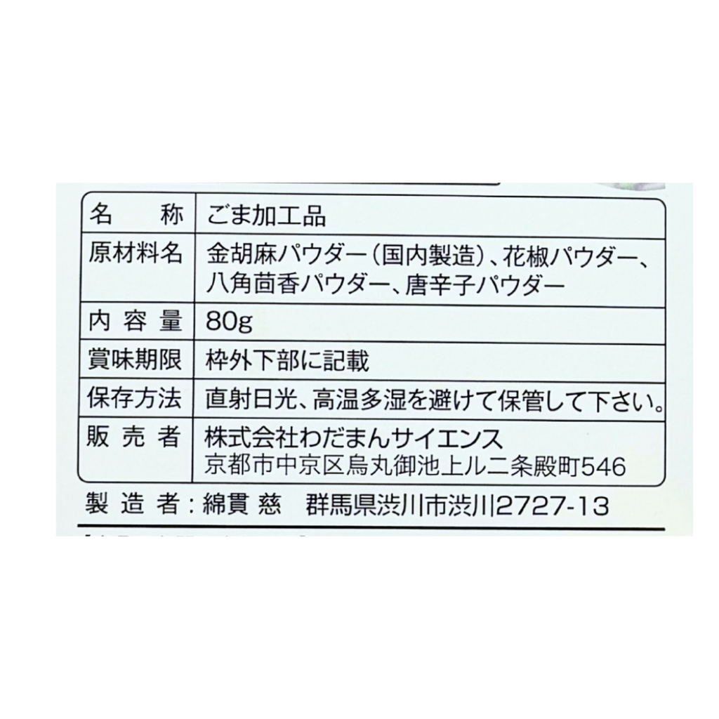 金胡麻パウダー(国内製造)、花椒パウダー、八角茴香パウダー、唐辛子パウダー