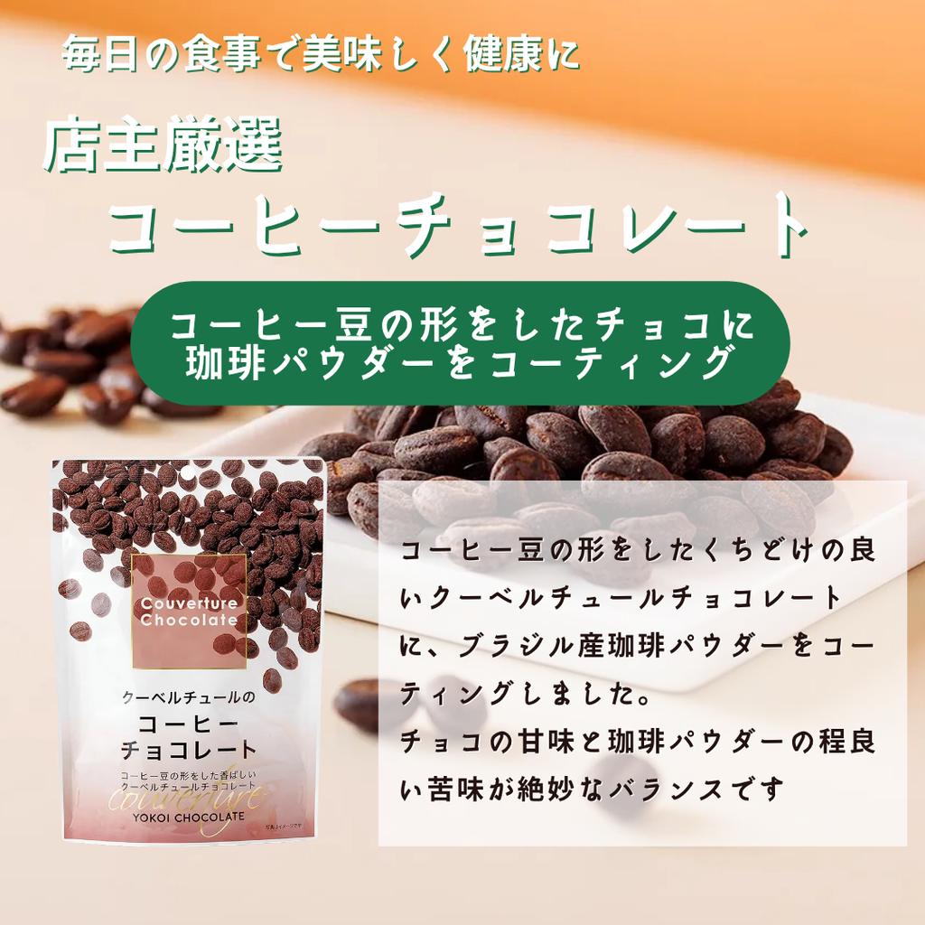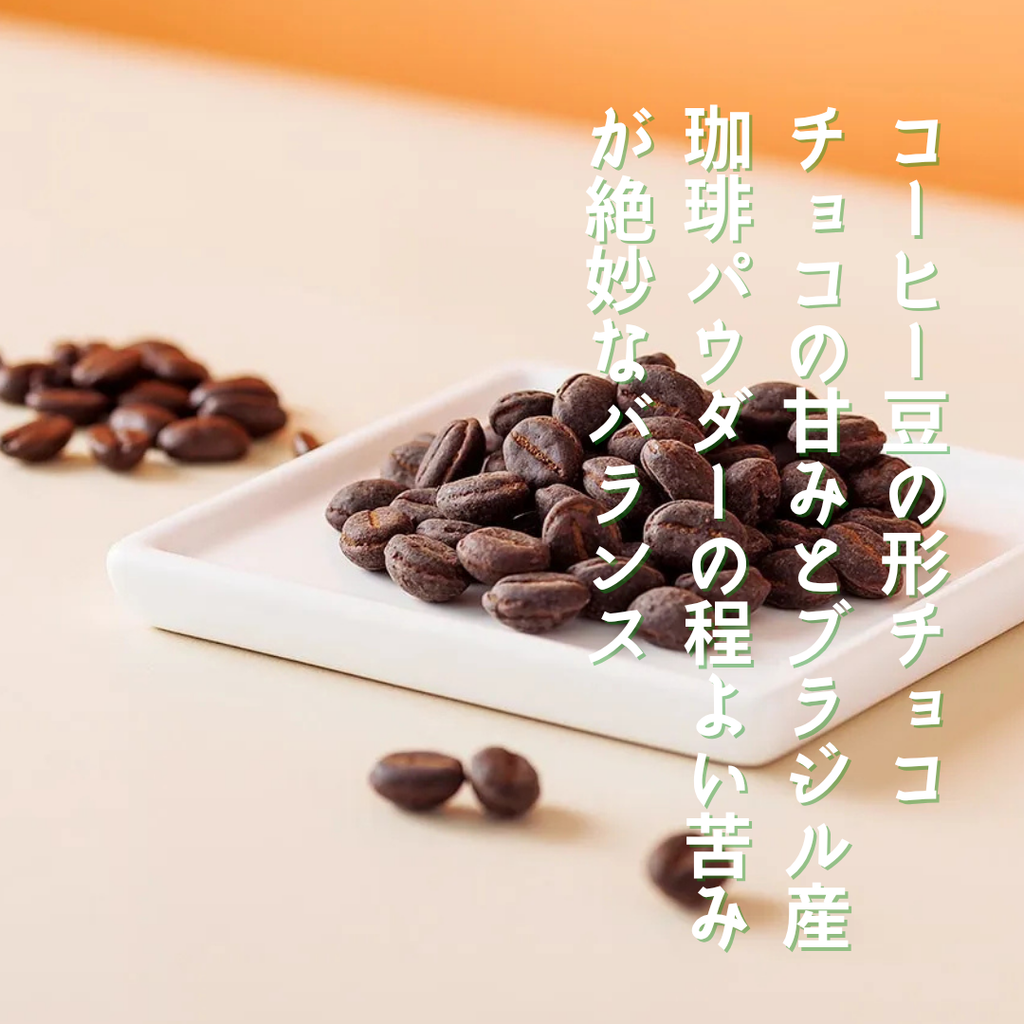 コーヒー豆の形をしたくちどけの良いクーベルチュールチョコレートに、ブラジル産珈琲パウダーをコーティング。チョコの甘味とコーヒー豆の苦味が絶妙なバランス。