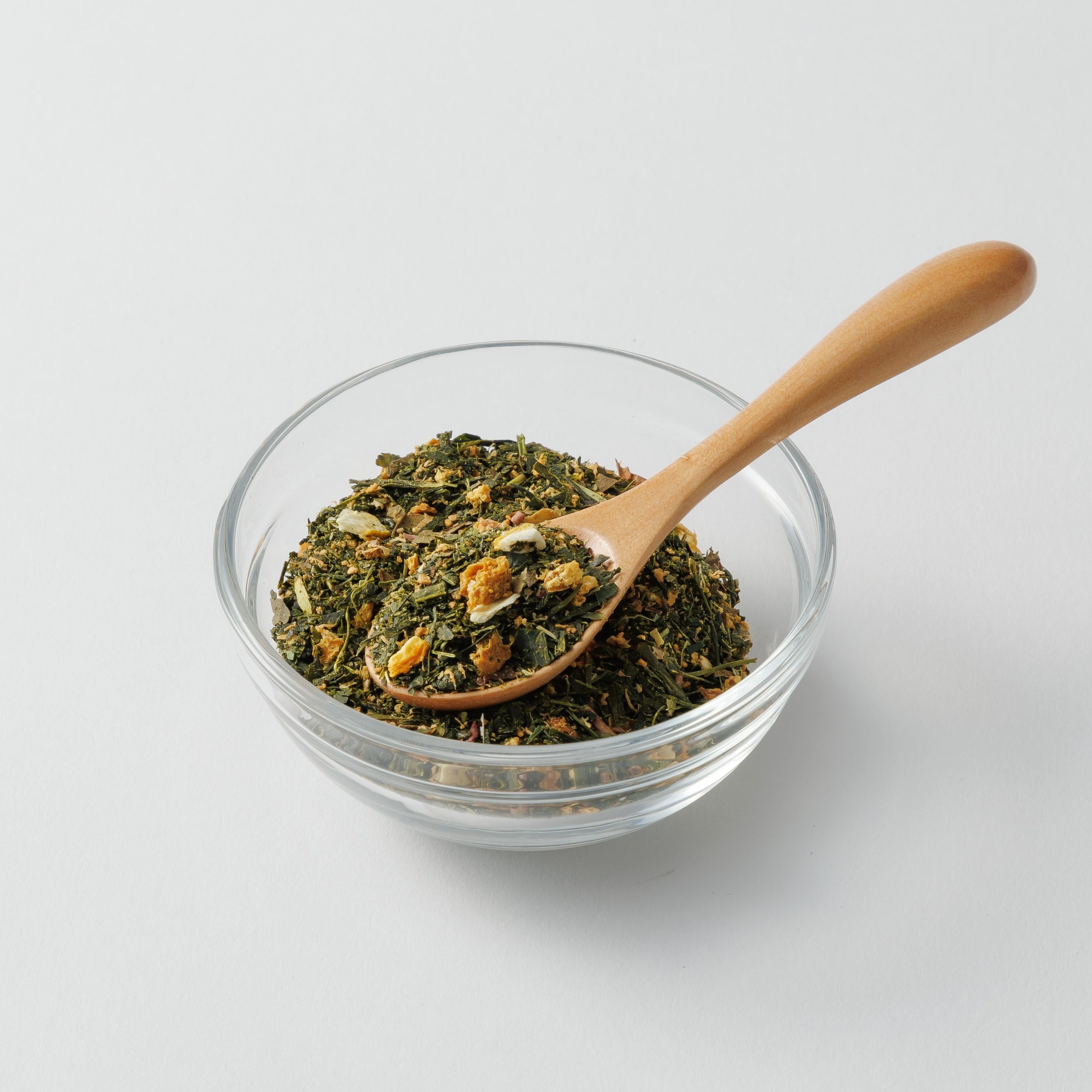 茶葉とフィルターがセットされているので、お湯を注ぐだけで入れての緑茶が楽しめます。急須でいられる日本茶のように2煎目、3煎目までお楽しみいただけます。すっきりした味わいの緑茶に、みかん、柚子、レモンのチップと、香の良いハーブをブレンドした、さわやかな風味の緑茶です。香料・添加物不使用の体に優しい飲み物です。